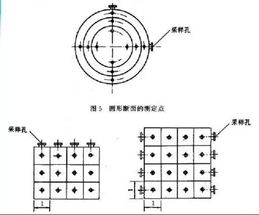 對圓形煙道,采樣孔應(yīng)設(shè)在包括各測點在內(nèi)的相互垂直的直徑線上(如下圖所示)。對矩形或方形煙道,采樣孔應(yīng)設(shè)在包括各測點在內(nèi)的延長線上(如下圖所示)。
