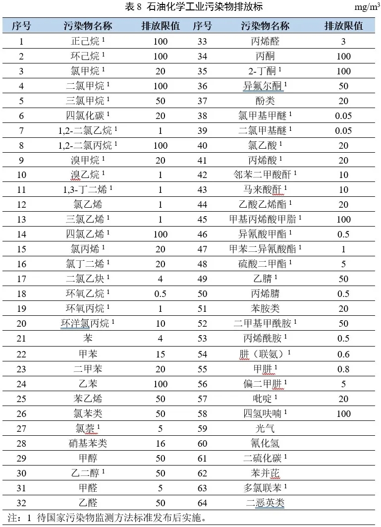 以石油餾分、天然氣等為原料,生產有機化學品、合成樹脂、合成纖維、合成橡膠等的工業,執行本標準。本標準是當前國家排放標準中涉VOC特征因子最多的排放標準。但大多數因子國家還未發布相關檢測方法。