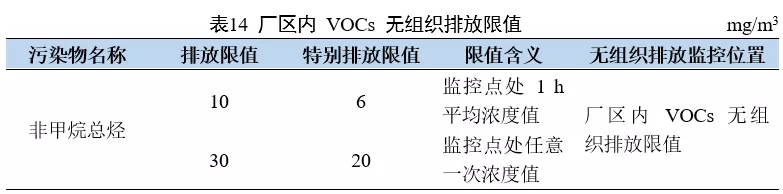 本標準規定了 VOCs物料儲存無組織排放控制要求、VOCs物料轉移和輸送無組織排放控制要求、工藝過程 VOCs無組織排放控制要求、設備與管線組件 VOCs 泄漏控制要求、敞開液面 VOCs無組織排放控制要求,以及VOCs無組織排放廢氣收集處理系統要求、企業廠區內及周邊污染監控要求。標準適用于涉及 VOCs無組織排放的現有企業或生產設施的 VOCs無組織排放管理,以及涉及VOCs無組織排放的建設項目的環境影響評價、環境保護設施設計、竣工環境保護驗收、排污許可證核發及其投產后的 VOCs無組織排放管理。標準主要對無組織管控提出要求,在限值方面,強調了廠區內 VOCs 無組織排放的限值要求,見下表。該標準已于 2020 年 7 月 1 日起全面實施。