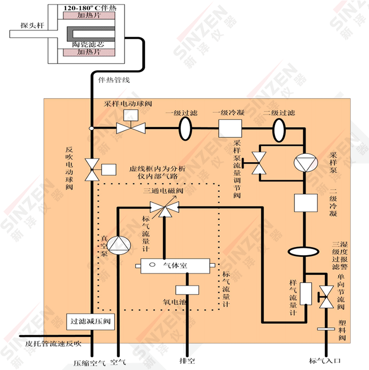 煙氣分析儀定時會進入校準狀態進行自動調零,此時系統切換到反吹氣路,調零閥打開,在分析儀內部采樣泵的作用下,環境空氣經過直接進入氣體室,對氣體室中殘留的被測氣體進行吹掃,從而實現調零,同時實現氧的量程校準;調零同時,系統控制反吹球閥開或關,實現對伴熱管、探頭過濾器的反吹。