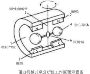 基本原理:其工作原理是基于氧的順磁性,一個小的逆磁性的啞鈴懸掛在非均勻磁場中,當被測氣體中有氧氣存在時,氧分子受磁場吸引導致啞鈴旋轉、補償力矩的張力要將啞鈴維持在原來的位置,張力的大小與樣氣中的氧分壓成正比。被測氣體氧含量不同,旋轉力矩和復位力矩的平衡位置就不同,也就是啞鈴的偏轉角度就不同,這樣,啞鈴偏轉角度的大小,就反映了被測氣體中氧含量的多少。對啞鈴球偏轉角度的測量,大多是采用光電系統來完成的。